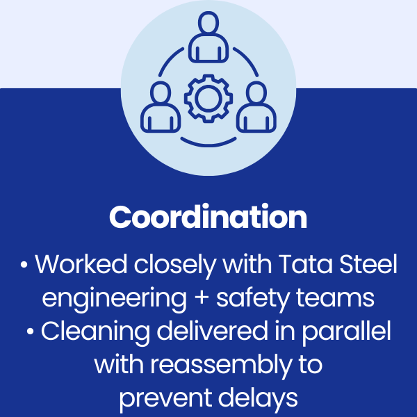 These inefficiencies led to extended downtime, increased costs, and disruption to tightly controlled production restart schedules. Tata Steel