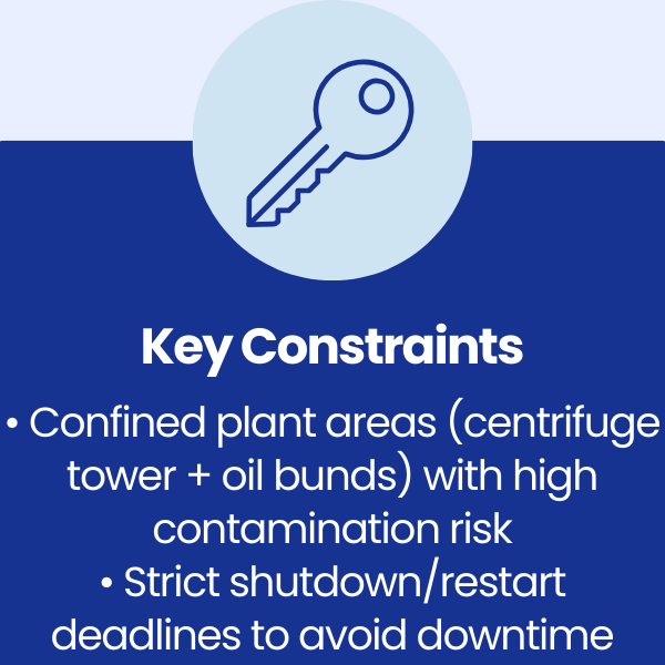 Ongoing challenges were being experienced during shutdown periods, particularly within the centrifuge tower and oil bund areas. Existing contract cleaning arrangements were causing delays due to inconsistent labour availability, reliance on hired equipment, and limited specialist industrial training.