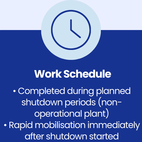 This approach eliminated delays associated with equipment hire and labour inconsistency, significantly improving shutdown efficiency.