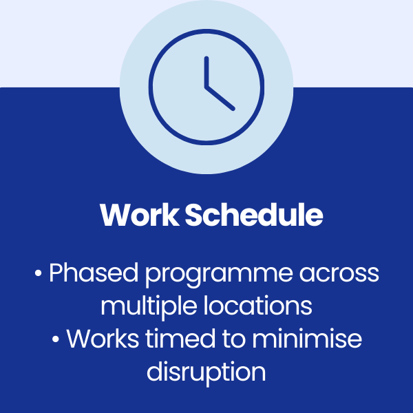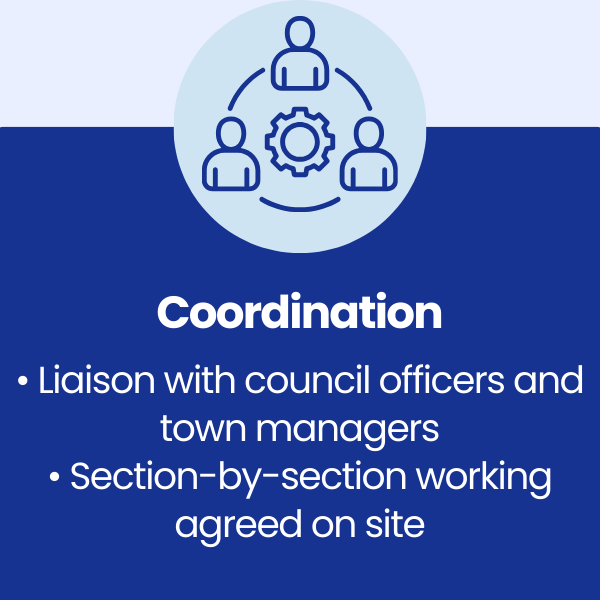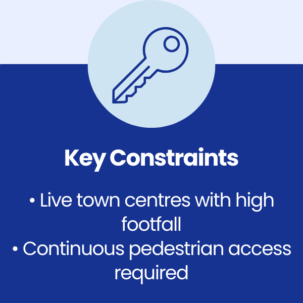 The works needed to be delivered while town centres remained fully operational, with shops open and continuous pedestrian movement, requiring a specialist contractor experienced in working safely and efficiently in live public environments.