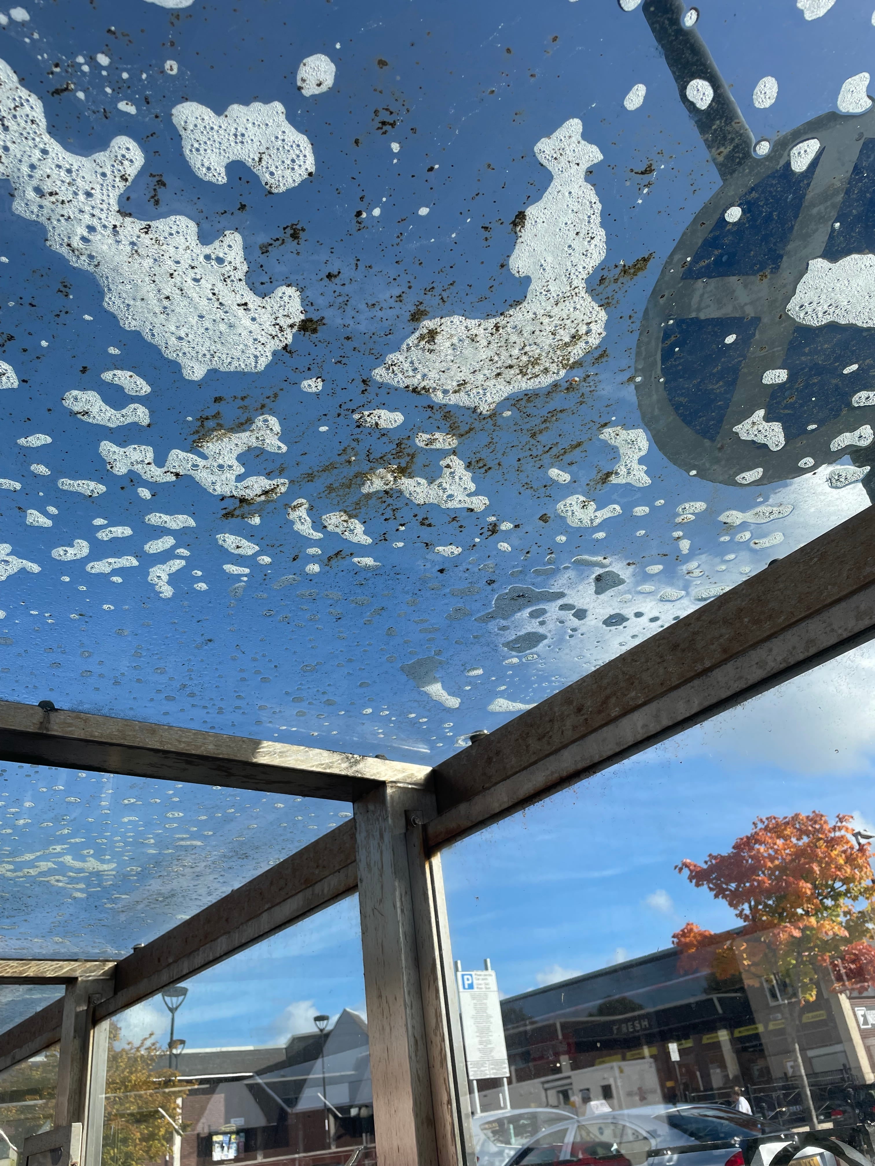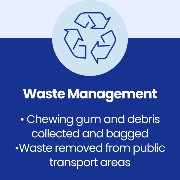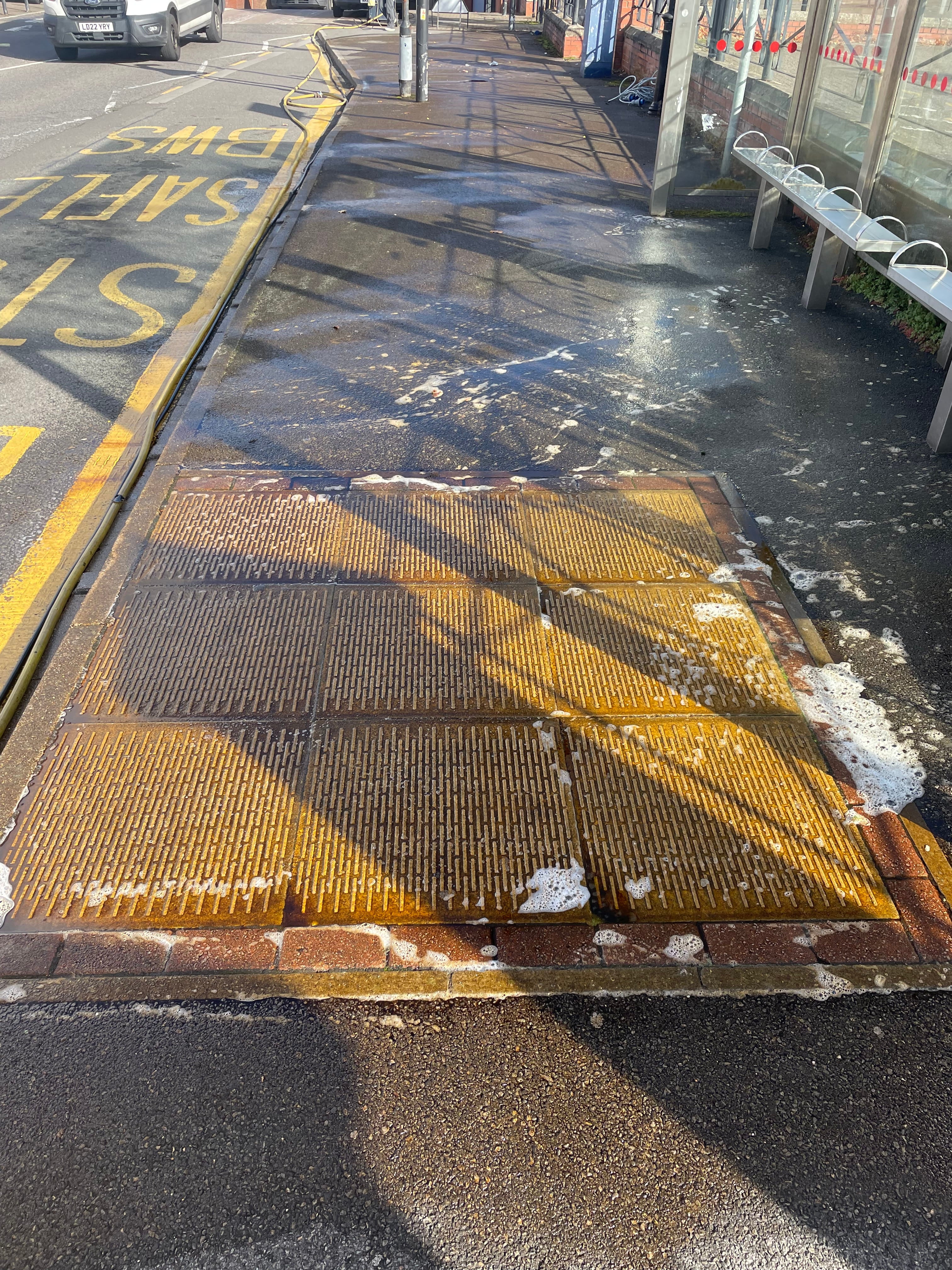 These locations experience constant footfall, waiting times, and repeated public use, resulting in heavy chewing gum build-up, ingrained dirt, grime, and algae growth on pavements and around shelter areas. Standard street-cleaning methods had proven ineffective, leaving surfaces visually poor and difficult to maintain.