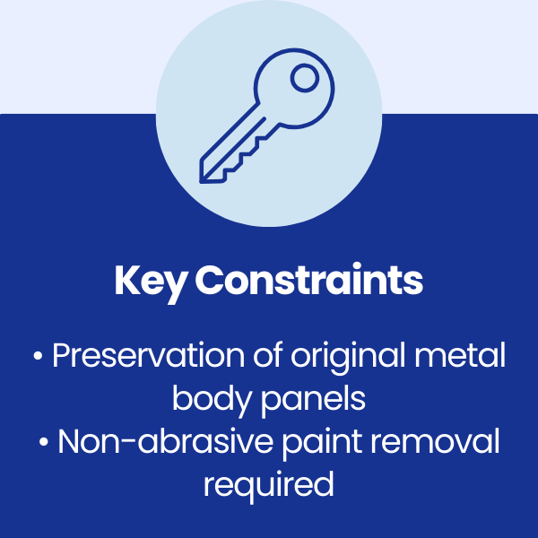 The challenge was to remove the paint back to bare metal in a controlled manner without damaging, warping, or distorting the original body panels, ensuring the car could be repaired and refinished to a high standard.