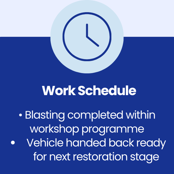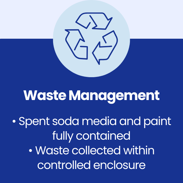 Soda blasting was selected due to its non-aggressive properties, allowing paint to be removed without damaging or warping metal panels. Low working pressures were used to maintain control and protect large, flat body sections.