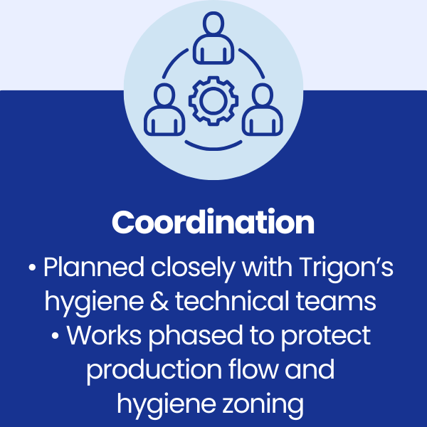 Trigon Snacks required a specialist commercial food factory cleaning contractor to support ongoing BRC and AIB audit readiness and continuous hygiene improvement at their Aintree manufacturing facility.