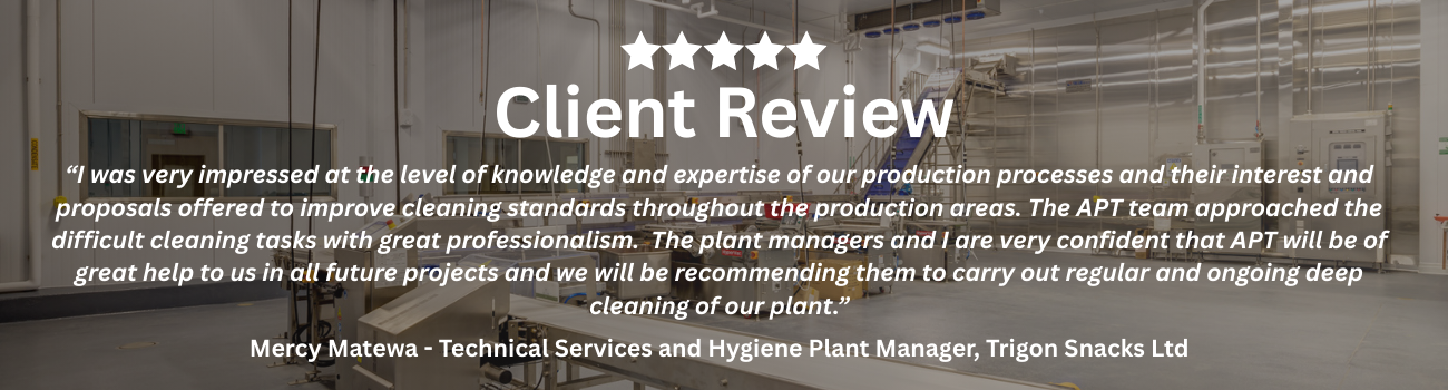 All products used were APT Commercial Chemicals formulations, selected for food safety, effectiveness, and suitability within regulated manufacturing environments.