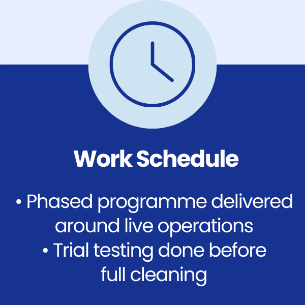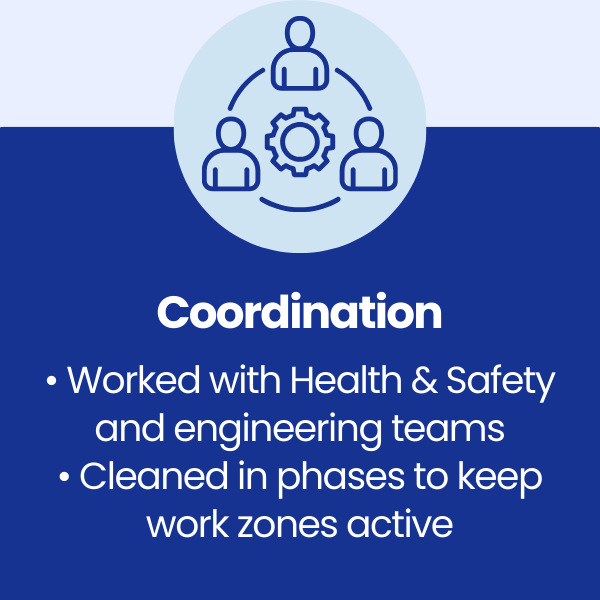 Controlled trial testing was completed using specialist industrial degreasers to confirm surface safety and cleaning effectiveness. A phased cleaning programme was then developed to deliver deep cleaning across machinery, production zones, and warehouse floors while maintaining safe access routes throughout the plant.