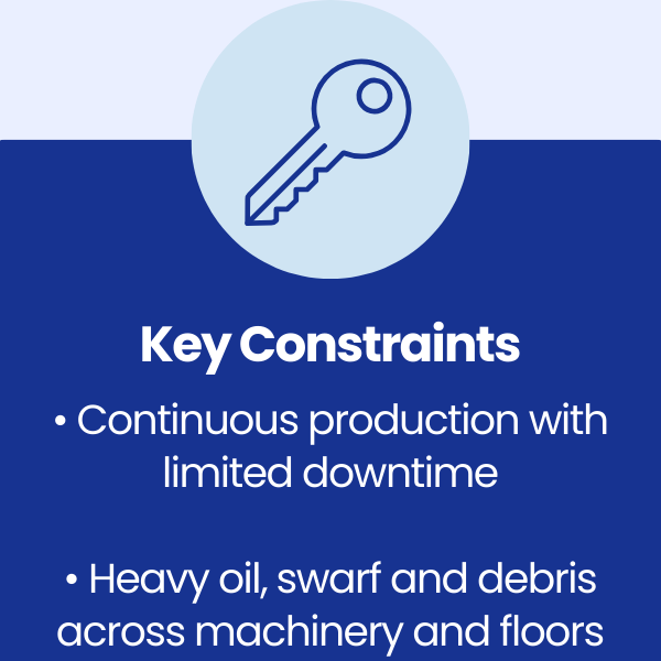 Key production machinery, tooling areas, and surrounding floors had developed a long-term build-up of oil residues, swarf, debris, and engineering contaminants. Over time, these contaminants had spread into walkways and working zones, increasing slip risks and impacting overall presentation.