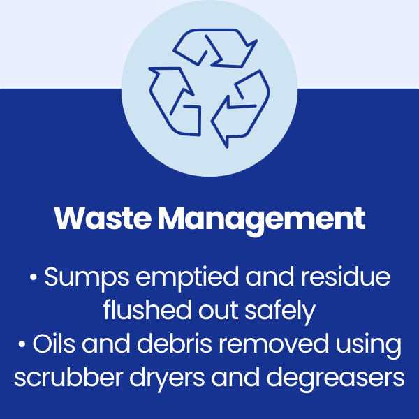 3. Emptying and flushing of machine sumps to remove internal residue build-up.