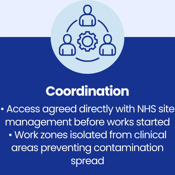 The assessment focused on identifying contamination risks, confirming isolation requirements, and determining appropriate cleaning and disinfection methods suitable for a healthcare environment. Protective measures for surrounding equipment and services were agreed, and a controlled cleaning plan was established prior to works commencing.