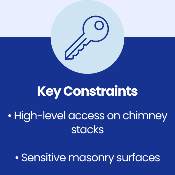 The assessment focused on selecting a cleaning method suitable for historic masonry and high-level access, while avoiding abrasive techniques that could damage the chimneys. The proposed method and expected results were agreed with the client prior to works commencing, ensuring alignment with the wider restoration programme.