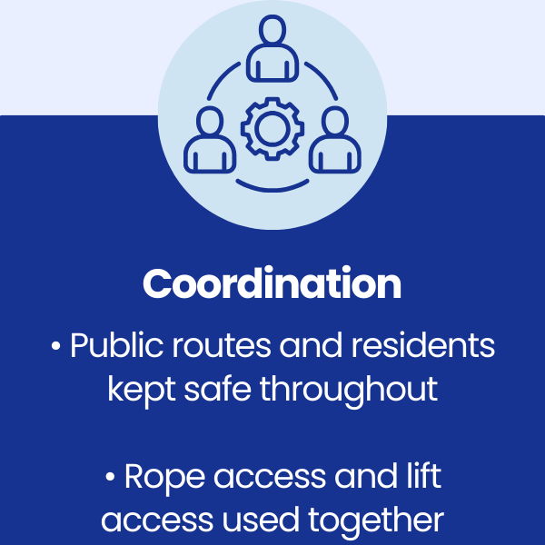 A comprehensive Health & Safety plan and access strategy was developed, covering rope access, lift access, public segregation and environmental controls. Additional consultative advice was also provided to support wider building maintenance and future renovation planning.