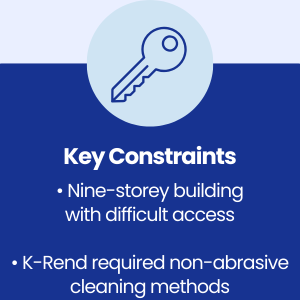 Due to the nature of through-colour K Rend, high-pressure cleaning methods were unsuitable, as they risk surface damage, water ingress and premature failure. The solution needed to be non-abrasive, controlled and capable of delivering long-lasting results.