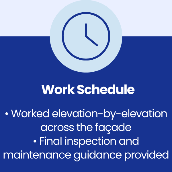 Rope access operatives and lift access teams worked methodically across upper elevations, balconies and restricted zones to ensure consistent cleaning results across all façades.