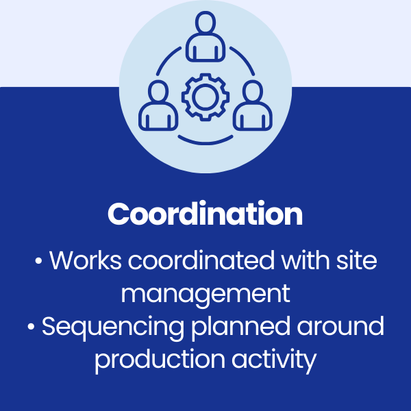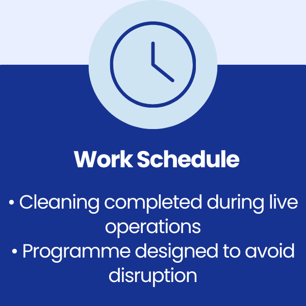A phased cleaning plan was developed, prioritising dry dust removal first, followed by mechanical floor cleaning and targeted machinery cleaning, ensuring contamination was removed safely and efficiently.