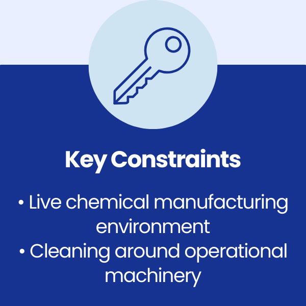 Americhem Europe Ltd required a professional warehouse and industrial floor cleaning contractor to address the build-up of dust and debris across production machine floor areas and warehouse zones within their chemical manufacturing facility.