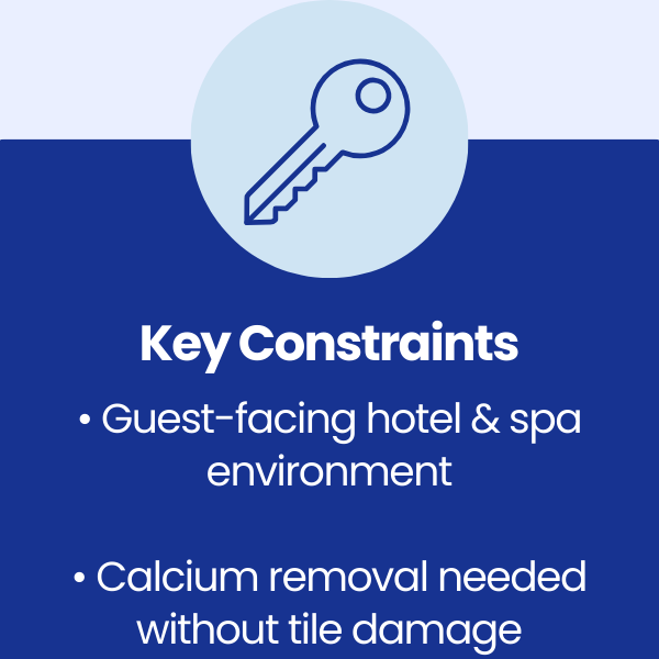 As a high-end hospitality venue, maintaining immaculate presentation across leisure facilities is essential. The client required a professional contractor capable of removing heavy calcium scale without damaging tiled finishes, while restoring the pool environment to a clean, premium standard suitable for ongoing guest use.