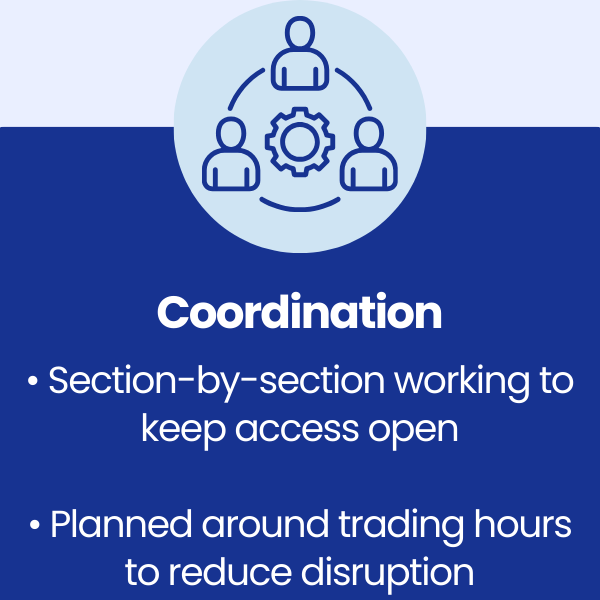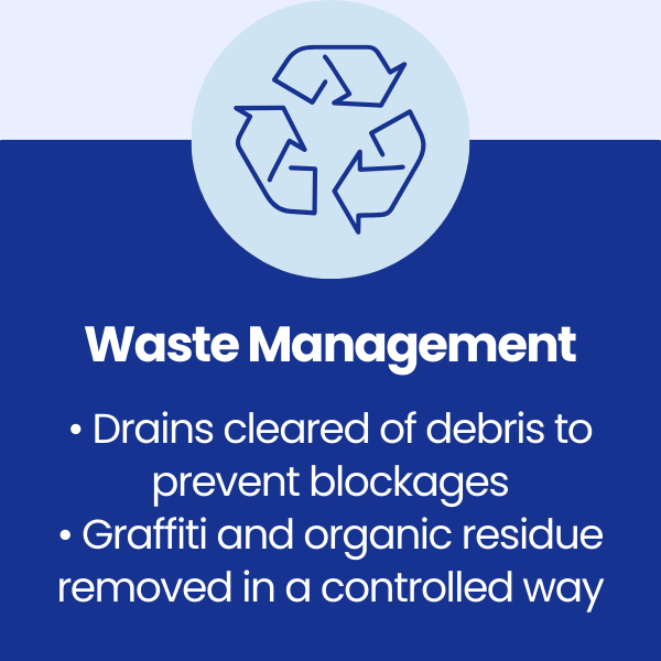 Product trials were completed in each treatment area to confirm the correct chemical selection and application method. This ensured maximum cleaning effectiveness while protecting surfaces and minimising impact on nearby public areas.