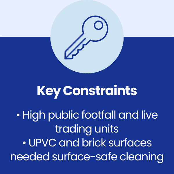 The client required a controlled, surface-safe cleaning solution that could be delivered in a live retail environment without disrupting trading activity or compromising public safety.