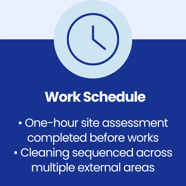 1. Trial cleaning and surface testing Initial test areas were completed to confirm the most suitable method and chemical for each surface type.